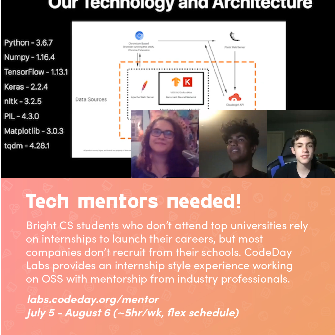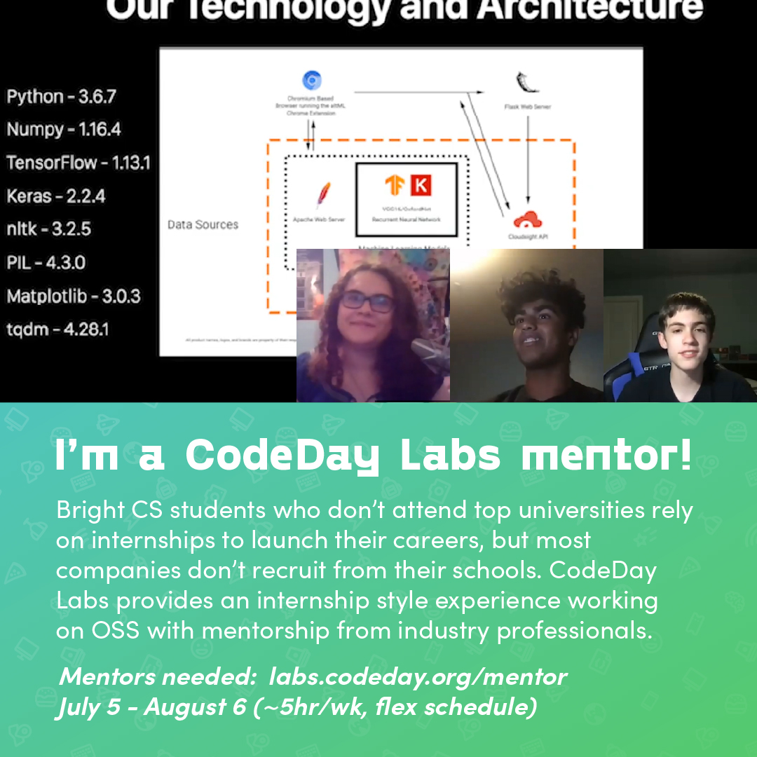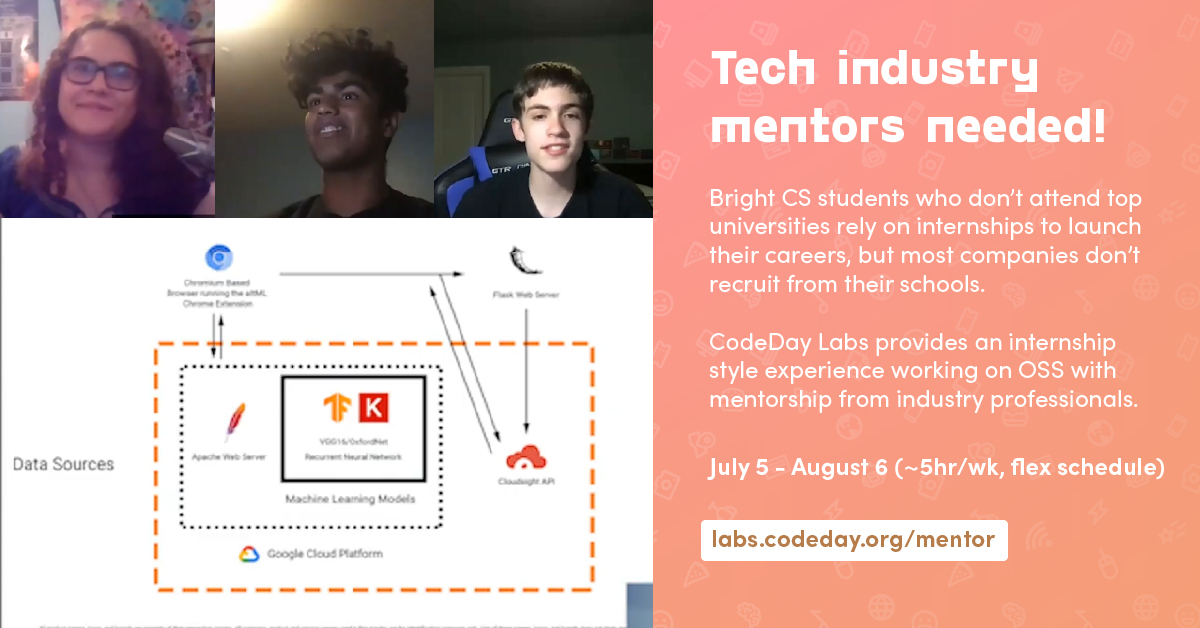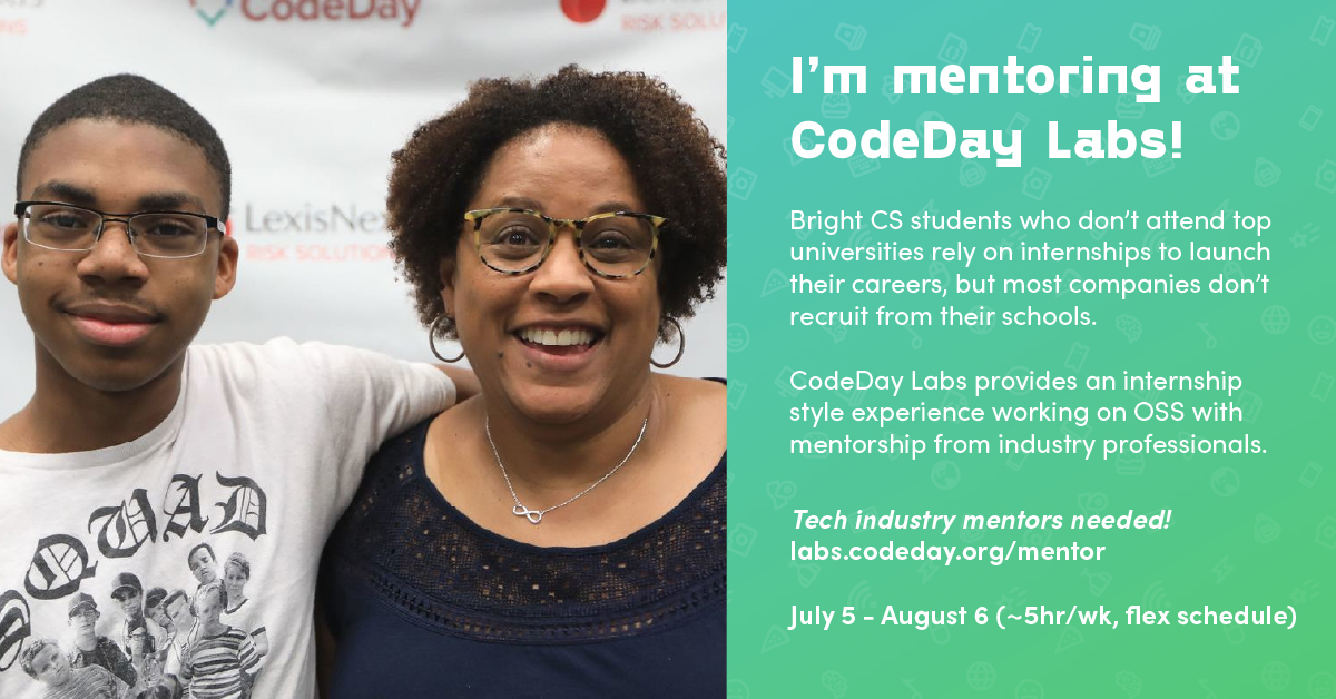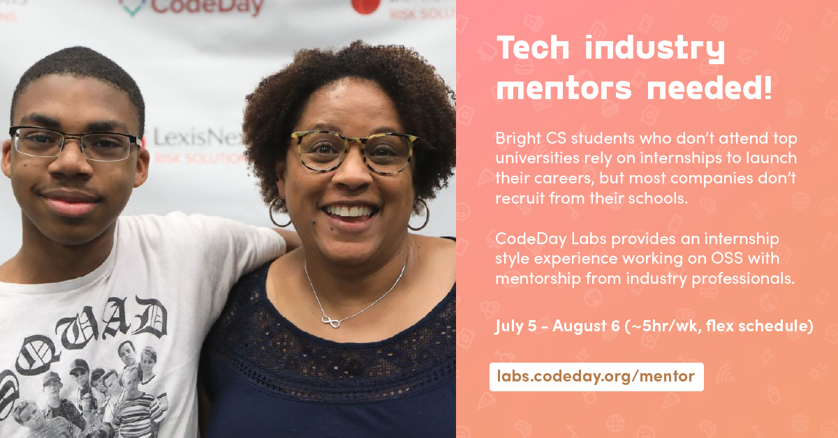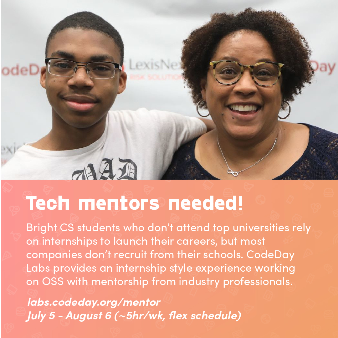 Mentor students as they build real-world software projects! (July 4 - August 5)CodeDay Labs is a non-profit program where mentors help CS students build a real-world software product. It provides a similar experience to a summer internship to students who weren't able to find one.